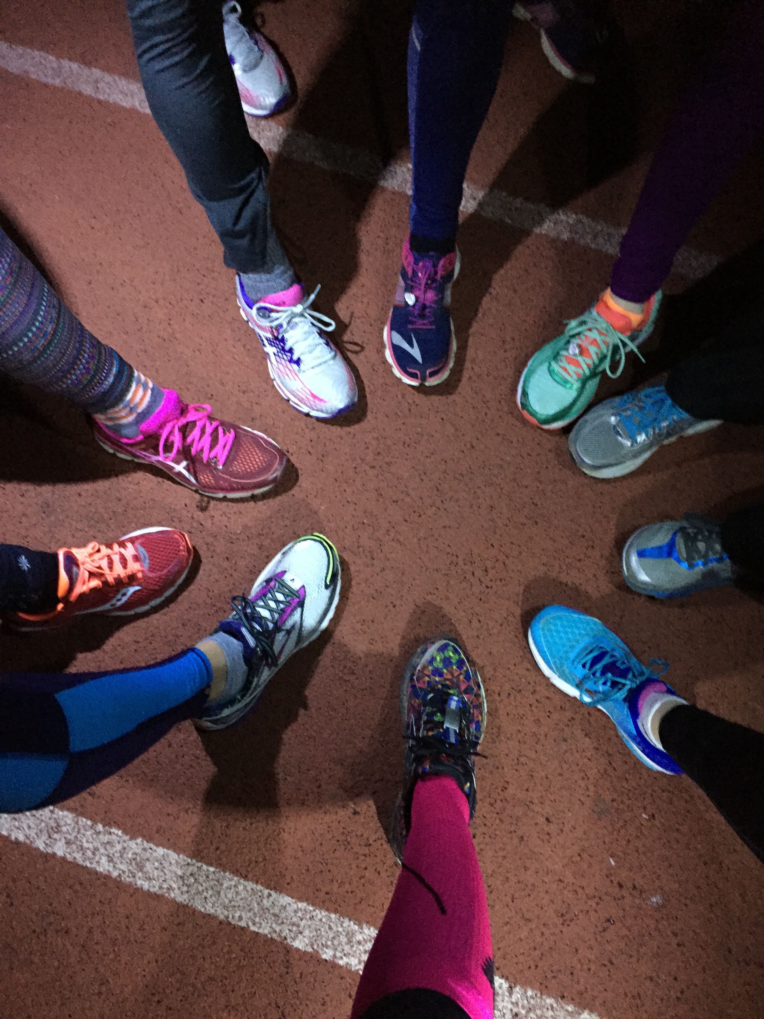 Part of the reason I took the race easy is because I wanted to have fresh legs for a mile time trial on my birthday. So Saturday morning (in 27 degree temperatures) I met a bunch of other intrepid ladies at a track in Springfield. We shared birthday treats, laughs, fleet miles, and some bleachers afterwards.